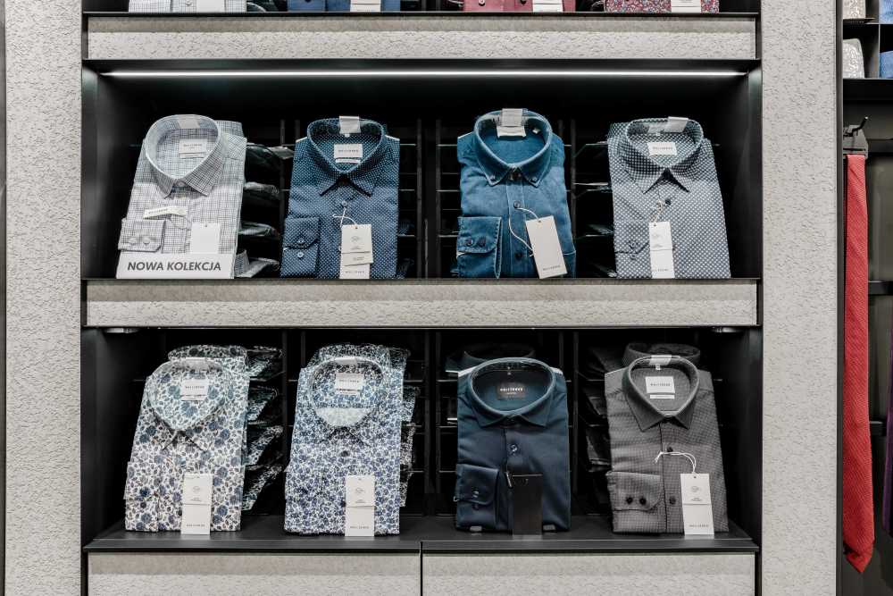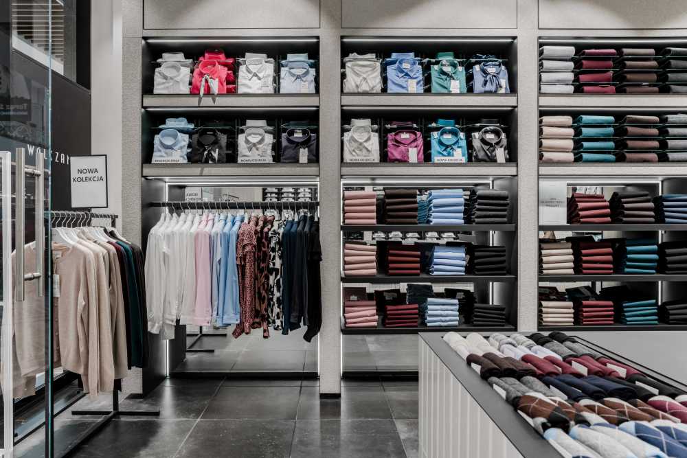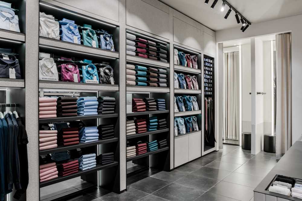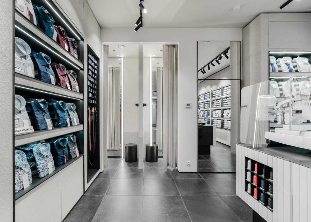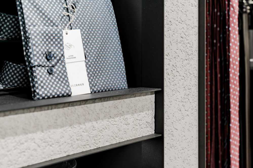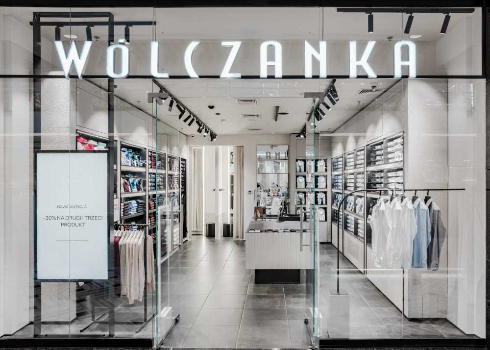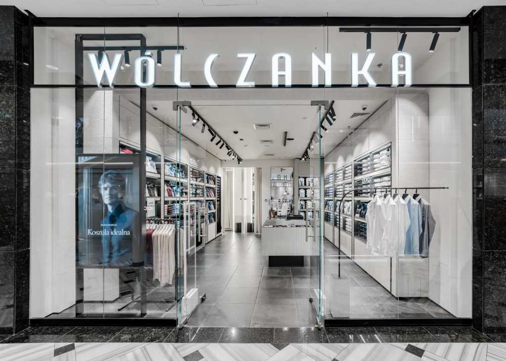 Wnętrze sklepu zbudowane zostało z zupełnie nowych minimalistycznych materiałów jeszcze nie często spotykanych na rynku polskim. Dzięki temu regały koszulkowe zyskały bardziej elegancką formę. Uzyskaliśmy efekt lewitujących, uporządkowanych koszul dzięki ekspozycji na szkle. Sklep ożywiają wielkoformatowe plakaty umieszczone na drzwiach przymierzalni. Stworzyliśmy nowy wizerunek witryny sklepowej Wólczanka. Standardowy kaseton reklamowy zastąpiliśmy logotypem literowym umieszczonym na stalowej belce na tle przydymionego szkła.