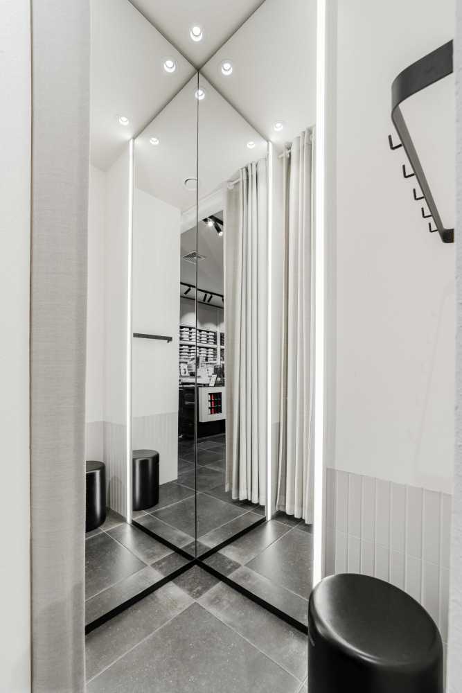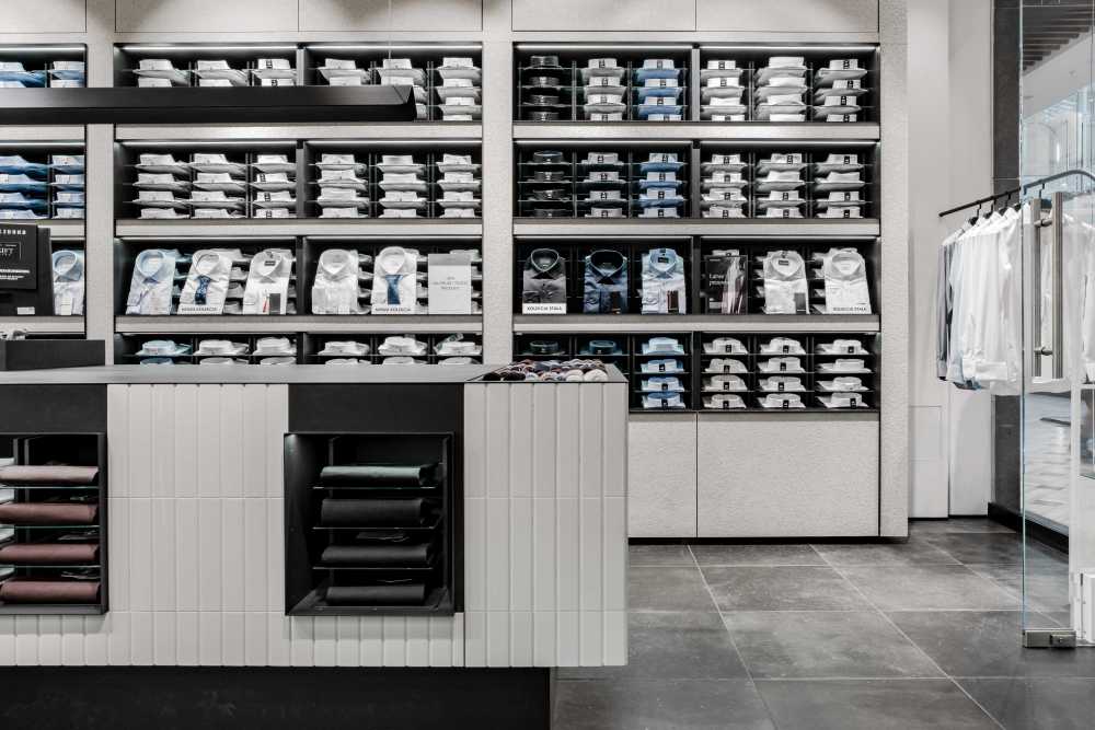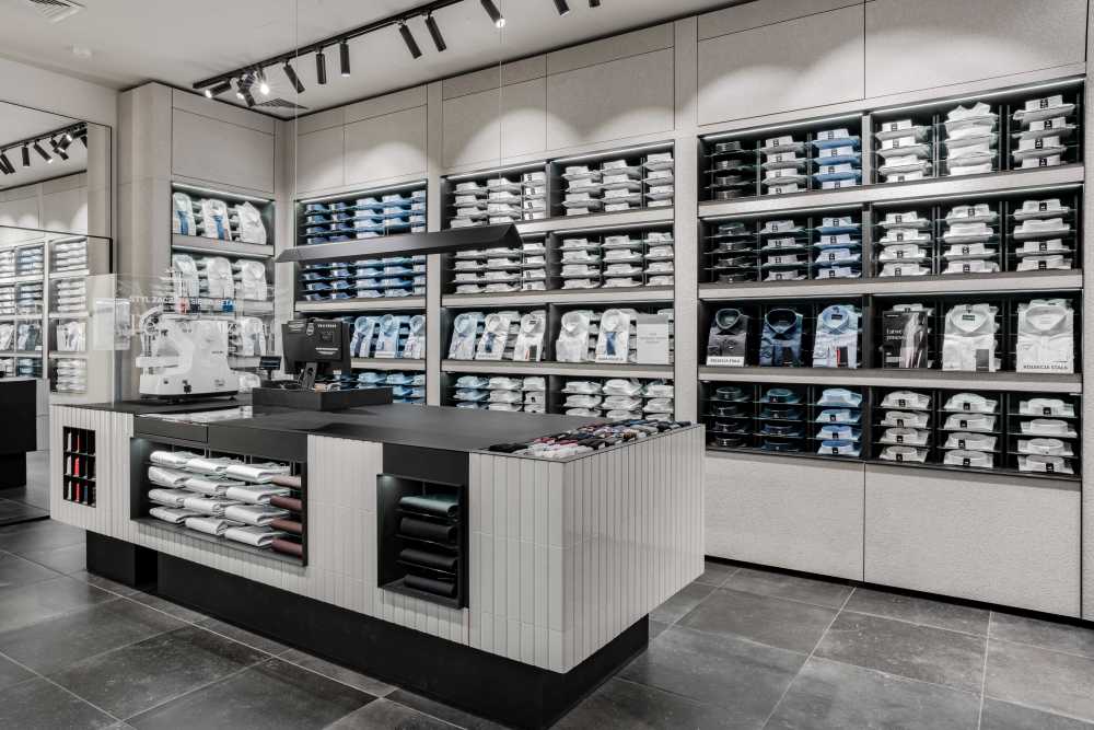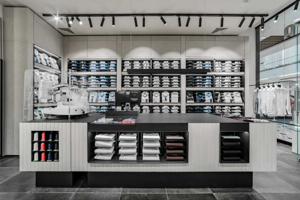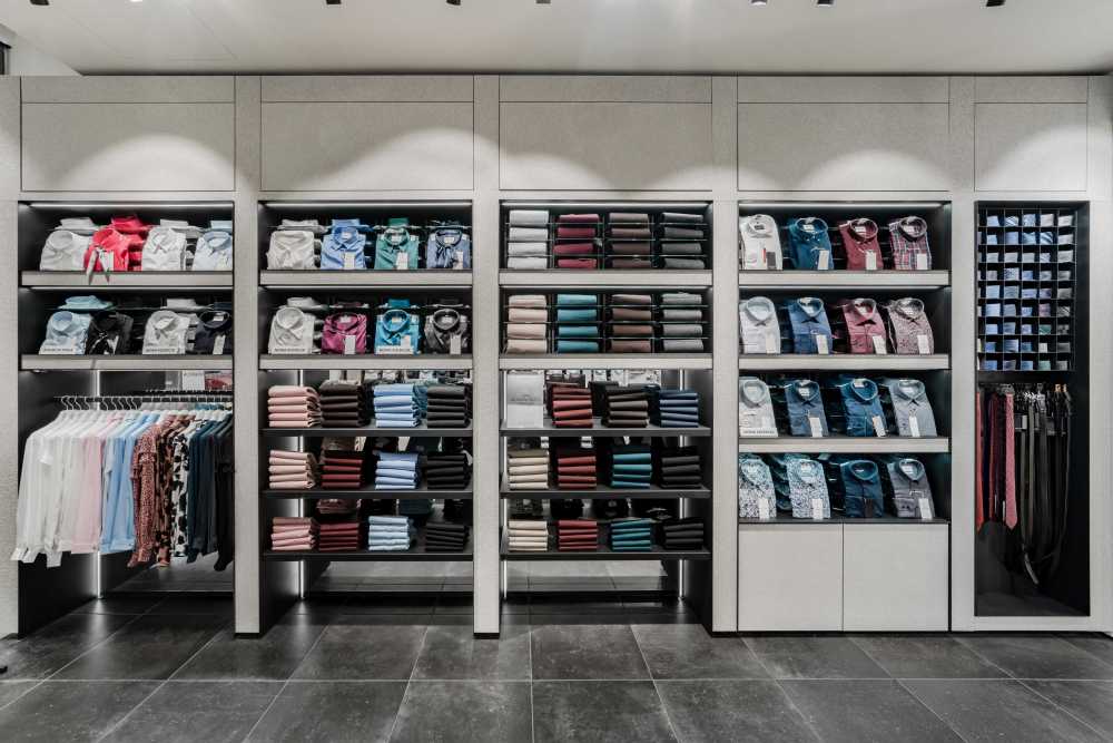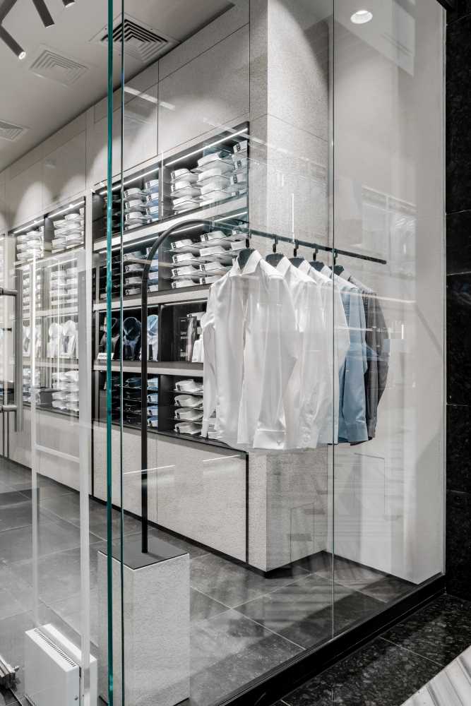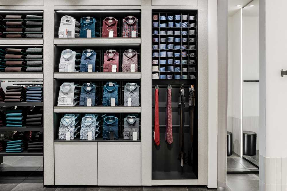 Wnętrze sklepu zbudowane zostało z zupełnie nowych minimalistycznych materiałów jeszcze nie często spotykanych na rynku polskim. Dzięki temu regały koszulkowe zyskały bardziej elegancką formę. Uzyskaliśmy efekt lewitujących, uporządkowanych koszul dzięki ekspozycji na szkle. Sklep ożywiają wielkoformatowe plakaty umieszczone na drzwiach przymierzalni. Stworzyliśmy nowy wizerunek witryny sklepowej Wólczanka. Standardowy kaseton reklamowy zastąpiliśmy logotypem literowym umieszczonym na stalowej belce na tle przydymionego szkła.