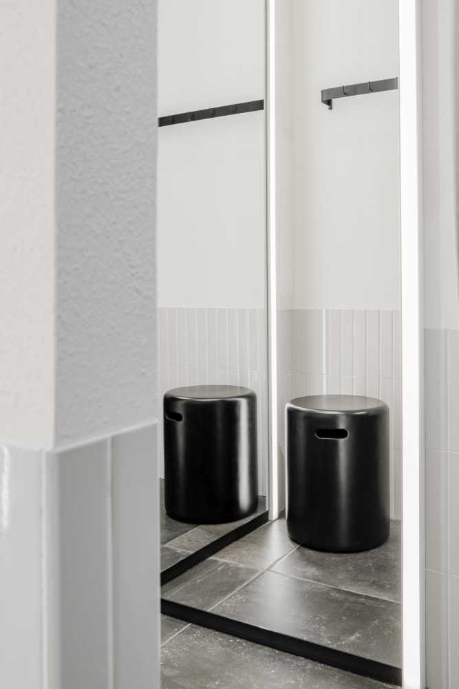 Idea LABORATORIUM KOSZUL powstała w kontekście tożsamości marki - wspiera jej industrialne korzenie, które widoczne są w detalach takich jak metalowe płaszczyzny styku z betonem oraz, nowoczesna dobrze "ugrontowująca" ciemna ceramika podłogowa. Szczególnie wyróżniającym się, a zarazem symbolicznym akcentem jest unikalna w tym kontekście lampa LEXAVALA wisząca nad wyspą kasową, która łączy techniczną formę, mosiężny detal oraz symboliczne światło przeszłości i przyszłości.